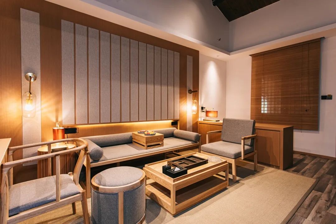 山田雅舍擁有兩個(gè)茶室,下沉式茶室位于山田雅舍的一樓,內(nèi)部設(shè)計(jì)的風(fēng)格延續(xù)了簡(jiǎn)約、古樸的理念,既保持了簡(jiǎn)約調(diào)性,又讓起居室變得更家細(xì)致。